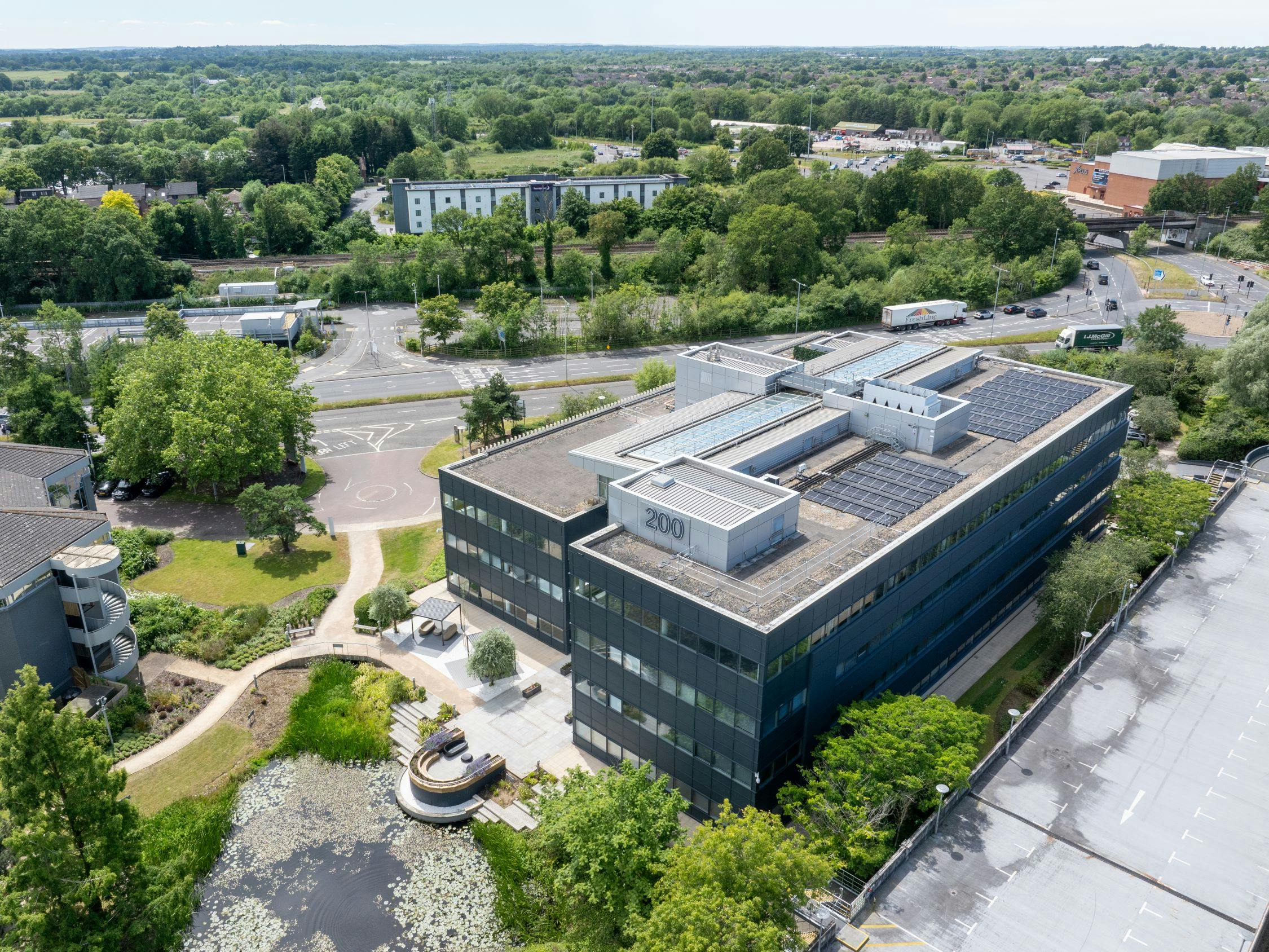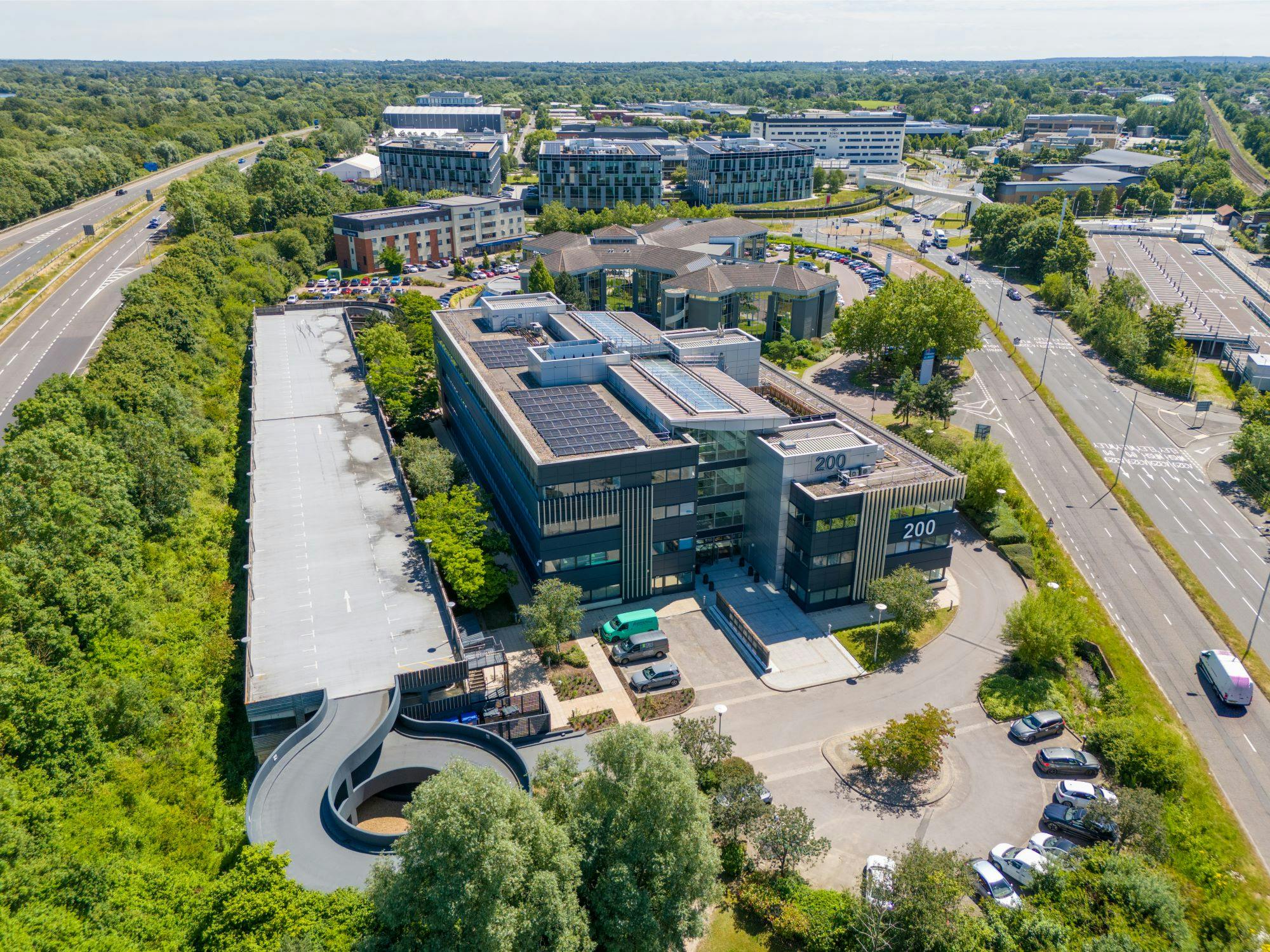 200 Berkshire Place is located adjacent to the A329M and Junction 10 of the M4. Access to the M4 can be achieved within 2 minutes drive of the building. For those who commute via train, Winnersh Triangle Train Station is within a 2 minute walk of the building. Local amenities include Hilton Hotels, Gather & Gather, WH Smith, Move HQ and Showcase Cinema de Lux.